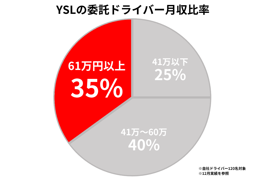 YSLでは委託ドライバーのうち約35%のドライバー様が月収61万円以上を達成しています。