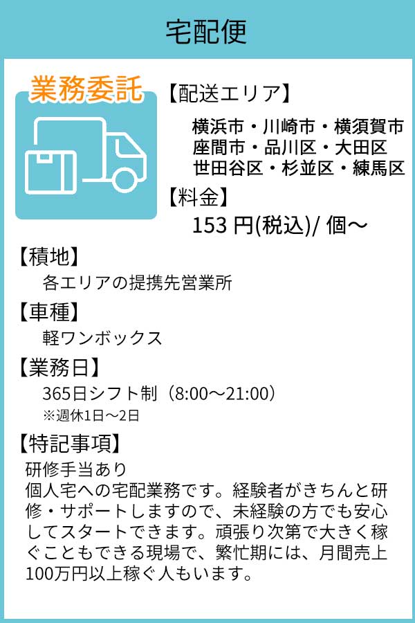 一般家庭や企業への配送がメインの「宅配」から、企業間の配送を行う「企業配案件」など、横浜商工ロジスティクスでは多種多様な配送業務がございます。稼ぎたい人から安定した収入を得たい人まで、個人に合わせた配送業務をご提案できます。お気軽にお問い合わせください。